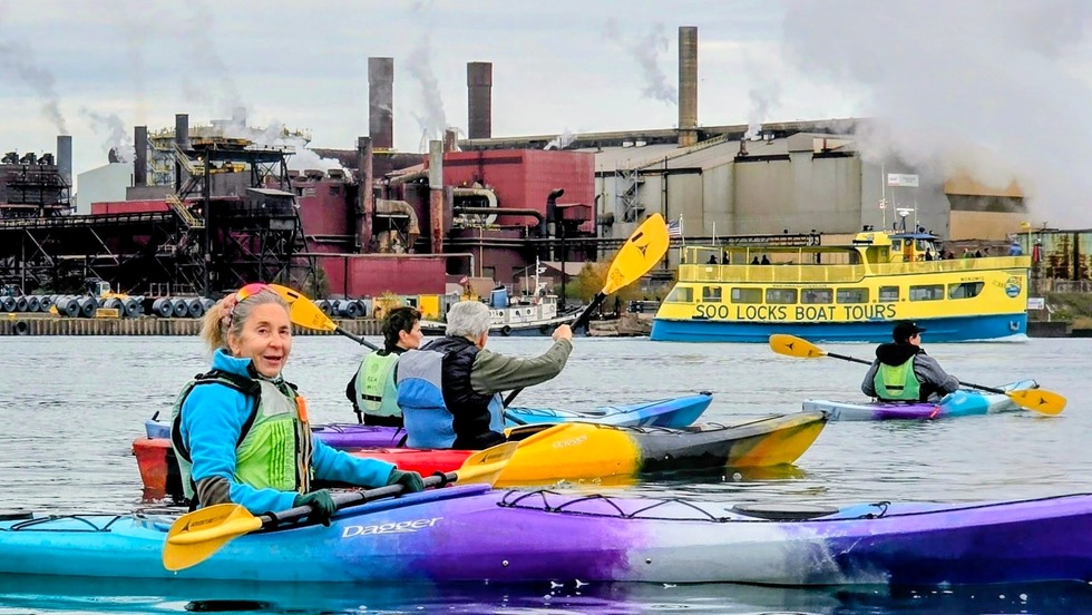 passing by the Algoma Steel mill located in Sault Ste. Marie, Ontario, beside the St. Marys River.
