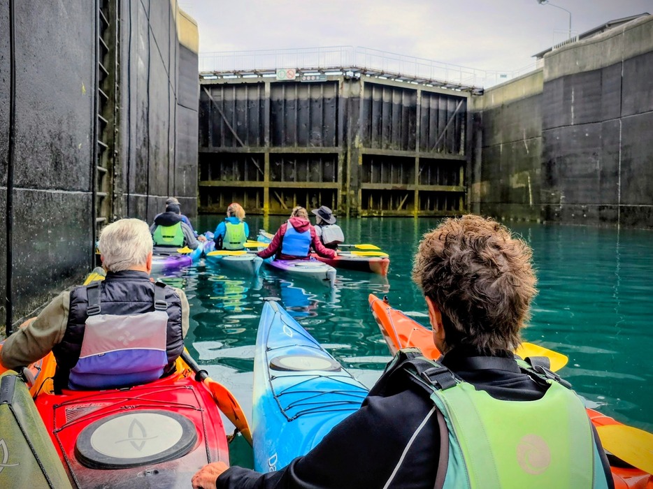 You can see the water level where we started. You definitely get that sinking feeling and the gate seems to get bigger and bigger. This couple kayaked thru the Suez Canal.