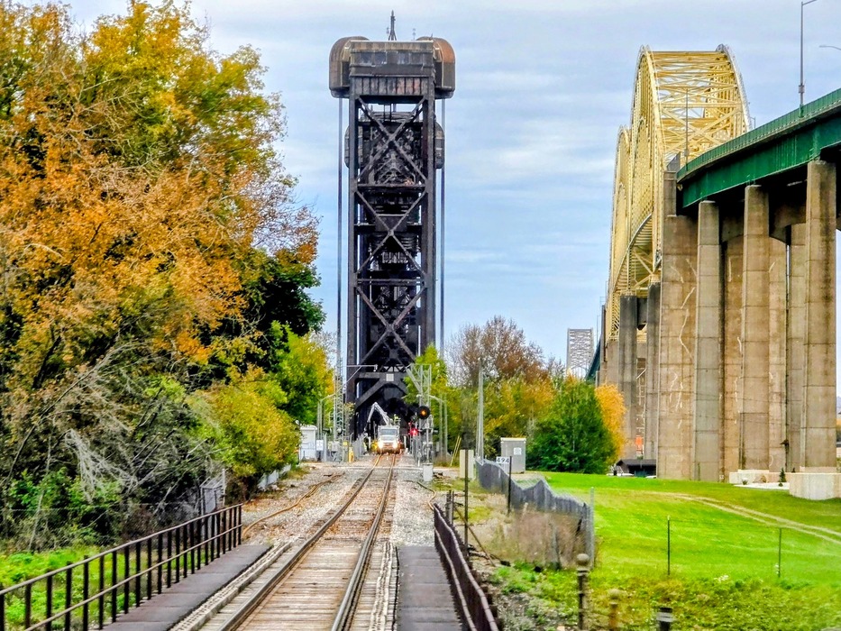 The structure on the left is part of the historic International Railroad Bridge, originally built in 1887 and later modified with a vertical lift span.