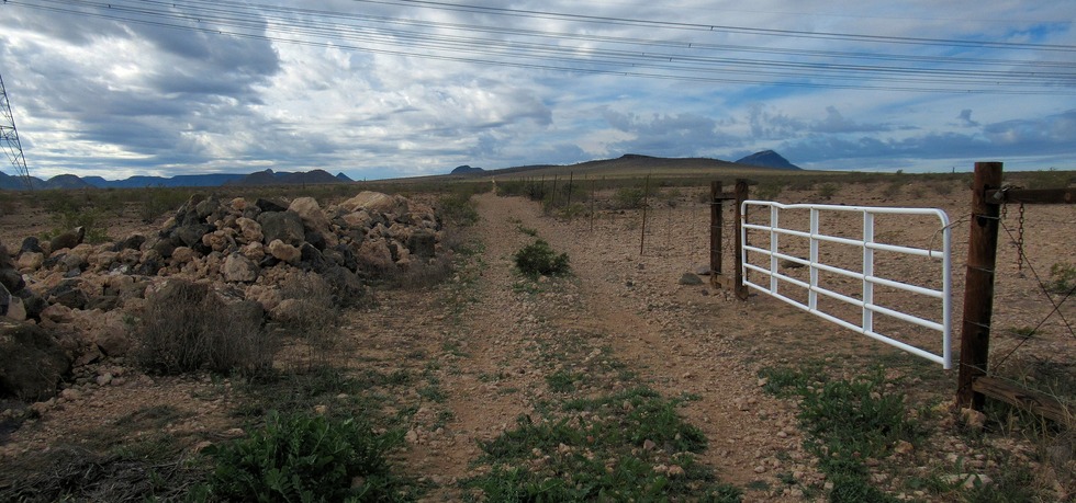 Turning southwest off power line road along fence line. Gillespie Volcano is the small bump right of center.