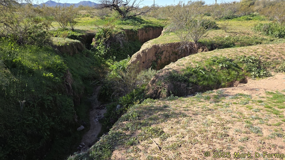 Very green and deeply eroded drainages near the old Sheep Bridge. 68.36° F