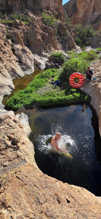 Karl showing his mad jumping skills. Chums used the full extent of his hot air to inflate his hemorrhoid cushion.
