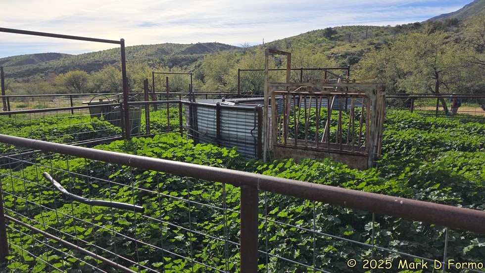 An old cattle 'Squeeze Chute' in the corral. 64.58° F