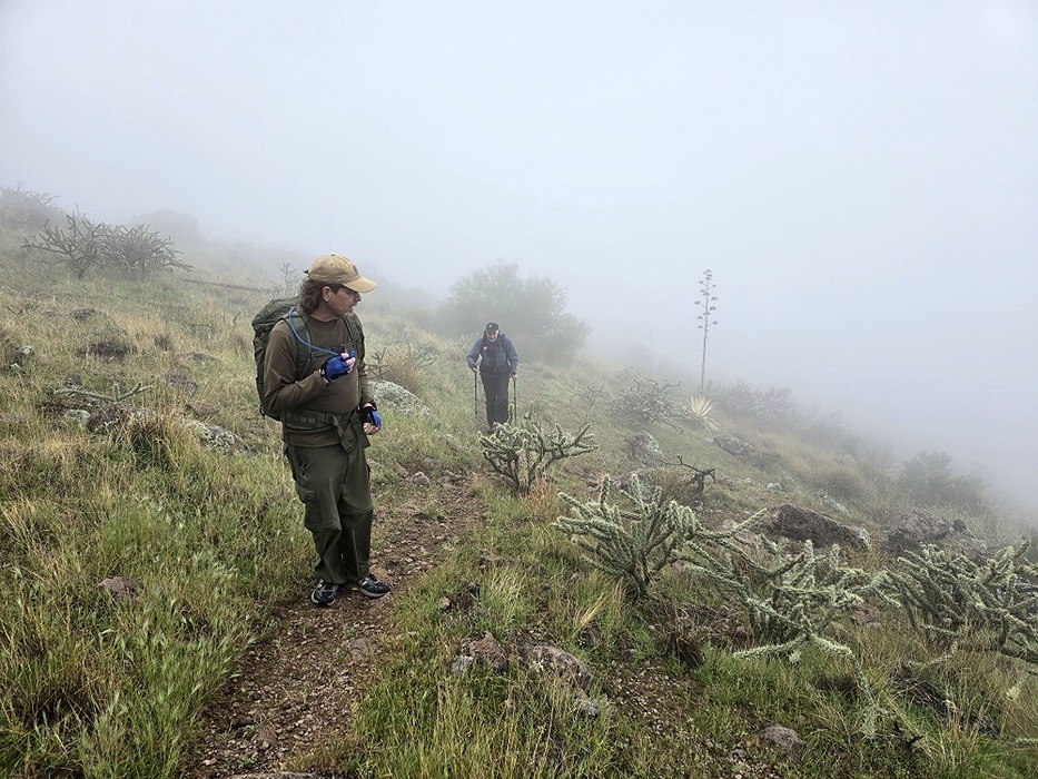 In the clouds for a short bit before topping out on the Butte. Todd in the foreground and Larry following.