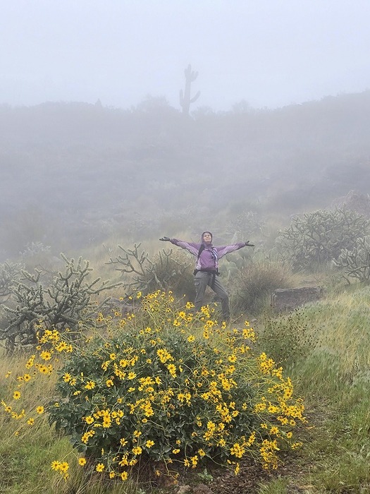 Winter in a Spring Desert with Diane celebrating a new knee. The Butte is just behind her.