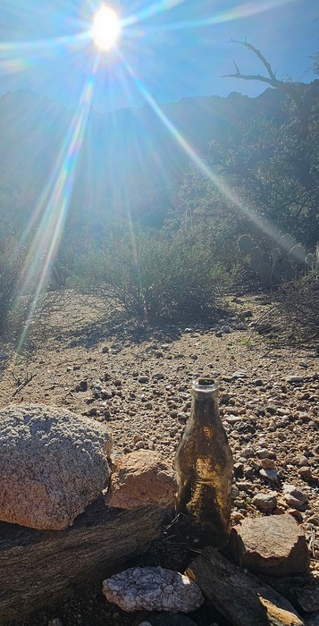 The cairn, 30 meters past the wash crossing with the dam. That is a 1970s vintage 10 oz Mr. Pibb bottle.
