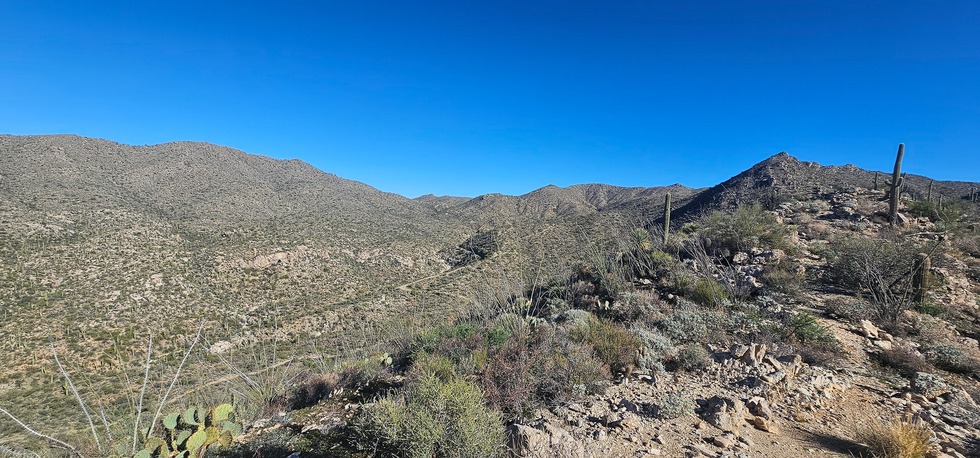 The north side follows a ridgeline up. On up the canyon you can see the main road and an abandoned track taking a different route on up