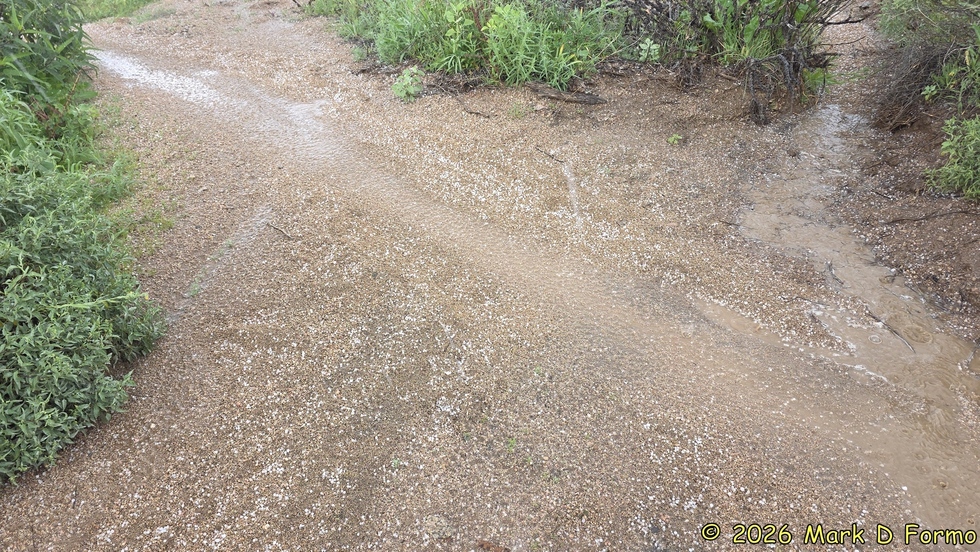 First it was light hail, followed immediately with a full downpour, and within the next 10 minutes my pants and footgear will be thoroughly drenched. Thankfully saw it coming and had donned my waterproof windbreaker barely seconds before the squall hit. 59.18° F
