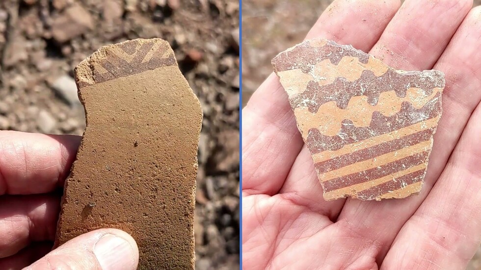 The nice red-on-buff Hohokam sherd (right) was also there. The really nice one on left was an isolated find in the middle of a small wash.