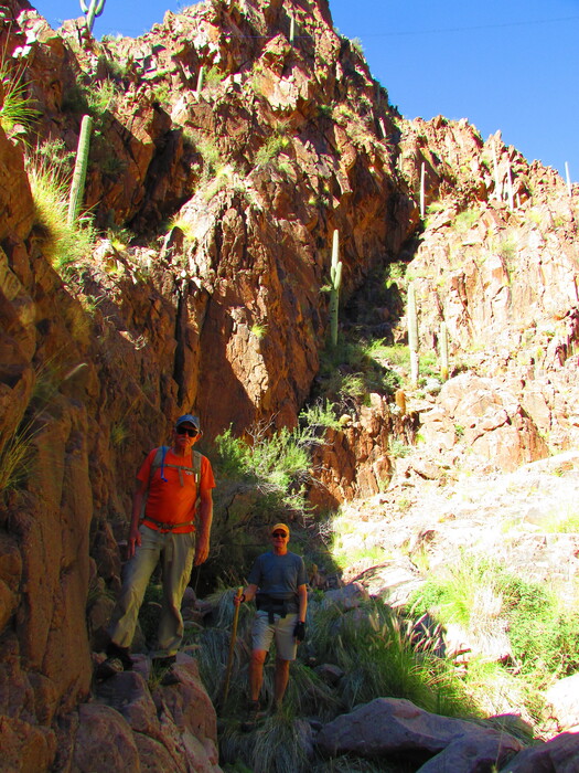 Todd and Jim work their way from the pools, down the ledge they came in on.