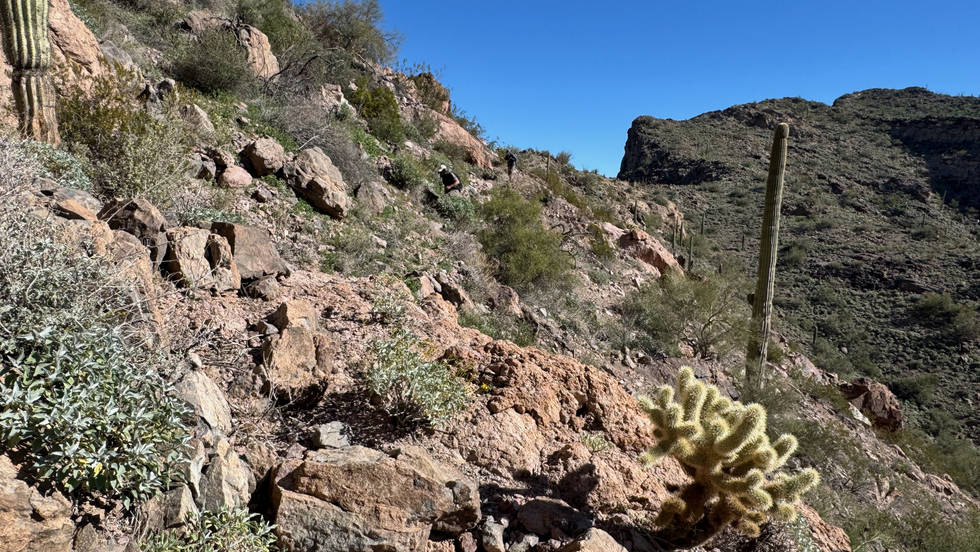 We found a nice sheep trail to traverse below the cliff to the drainage.