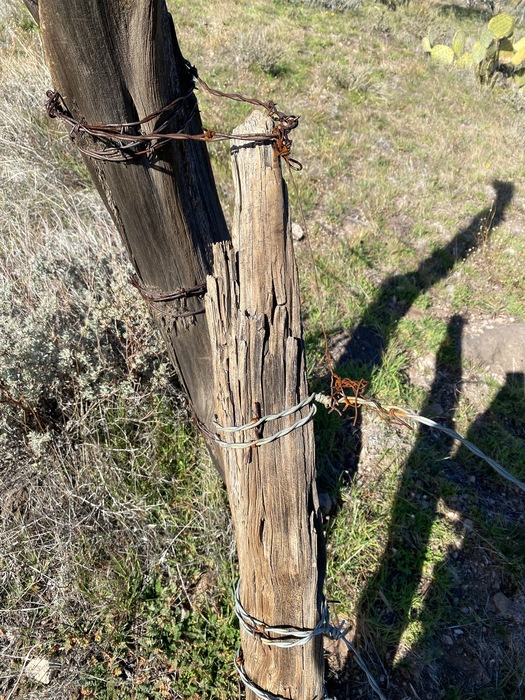 the gate...is effectively locked. That thin rusty wire makes it impossible to open. I was able to hop the fence to the left where the barbed wire had a bit of slack, allowing me to step over carefully.