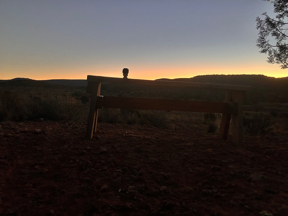 Hulk enjoying the sunrise from a bench near the beginning of the Cedar Knoll Trail