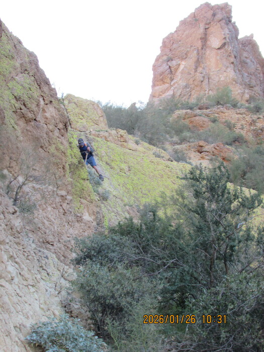 Ron shows the way. I had been here several times in the past and didn't think the wall could be climbed.