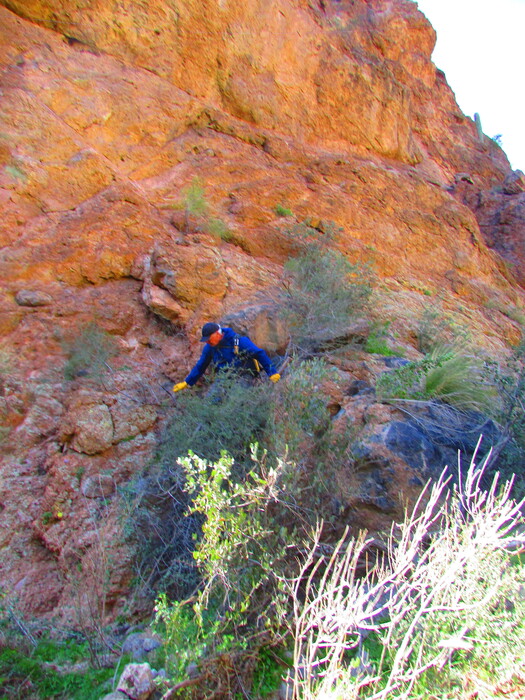 Glen trys to outdo us by working up the sidewalls of the canyon.