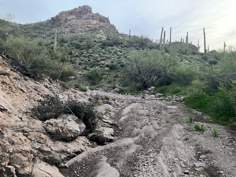 This is near the beginning of my entry into the R&R Wash. Signs of the recent rain still seen in the muddy soil. Near the top of the wash you can make out, one of many wash crossings done by the Rough and Ready Trail.