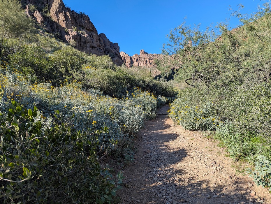Lots of brittle bush in bloom near the bottom of the trail.