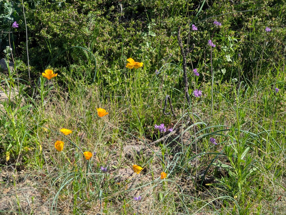 A bunch of poppies and some blue d-i-c-k-s. Interesting that when I type in the common name this web site replaces it with the scientific name. I had to put hyphens between the letters to get it to show what I typed. Who comes up with these plant names??