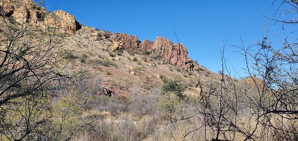 Looking up toward some rugged rock formations