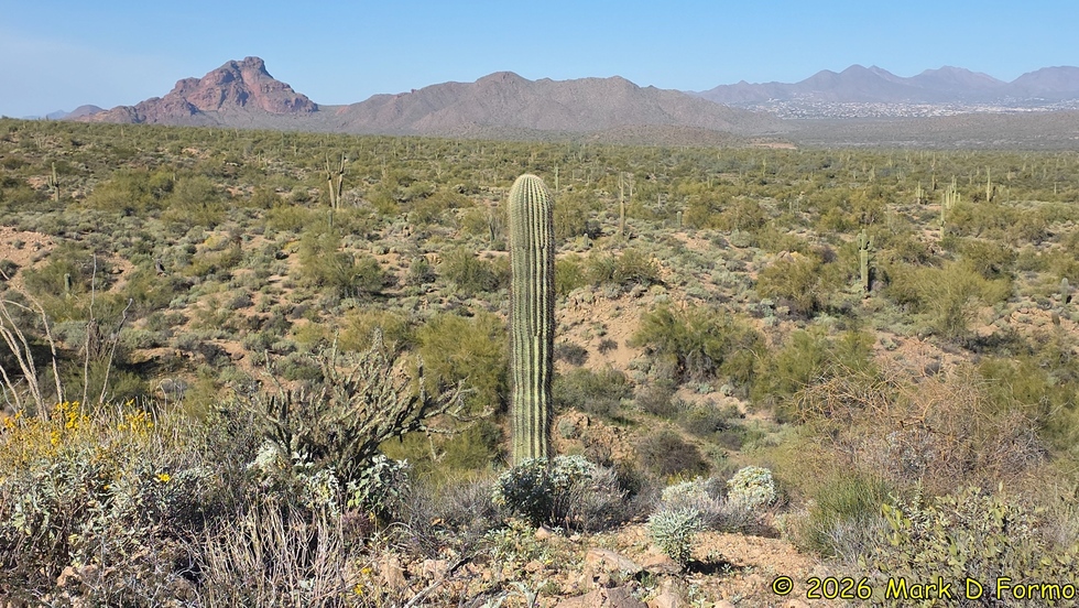 A pristine singular Saguaro Cactus backed up by Mount McDowell (Red Mountain), Arizona Dam Butte and the McDowell Mountains from left-to-right. 68.72° F