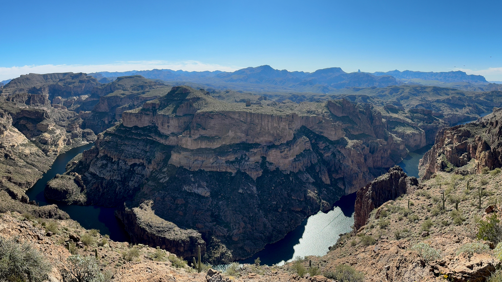 Pano view down the river. Horse Mesa on the left. ALL of the prominent peaks of the Superstitions across the frame.