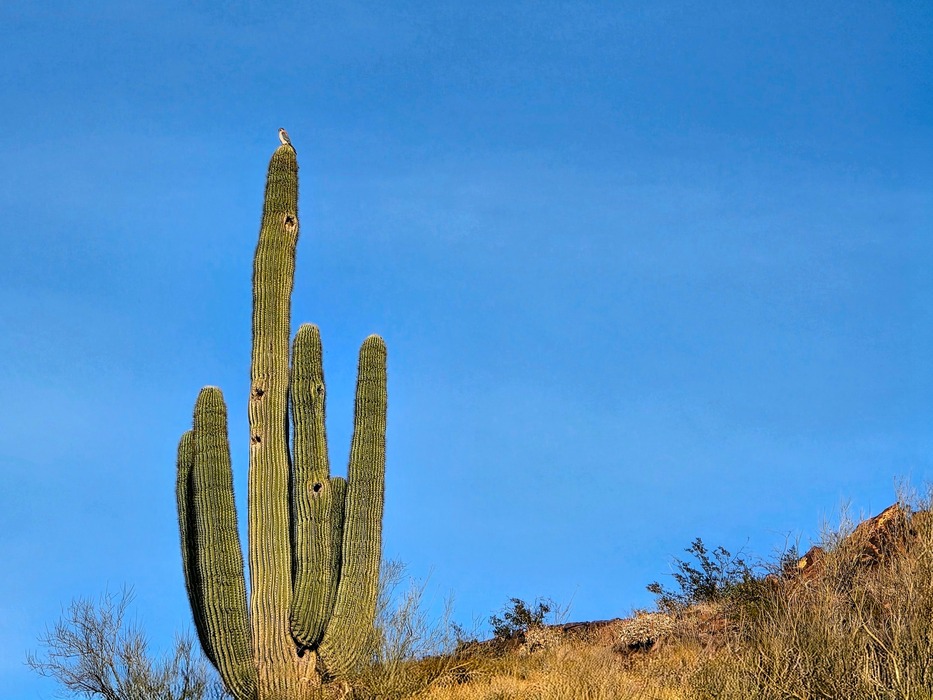 one more of the kestrel far awway. one of the few larger saguaros on the preserve.