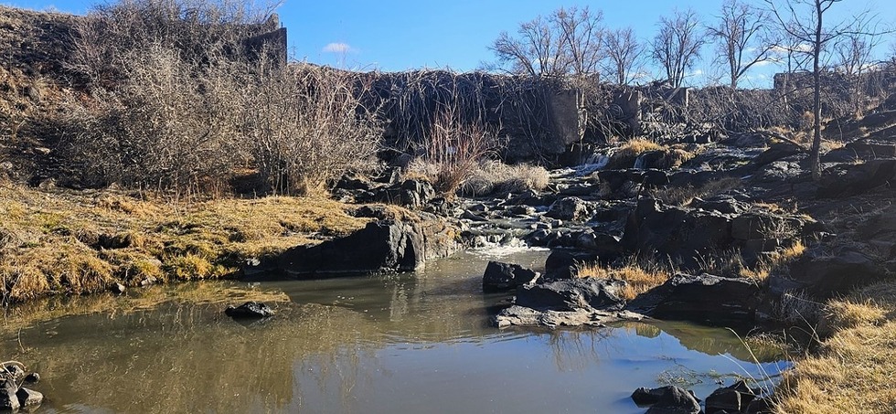 Water flowing down from the dam makes a nice sound. The river crossing is just behind where I'm standing. Stepping stones across. If river is high, you'd have a problem.