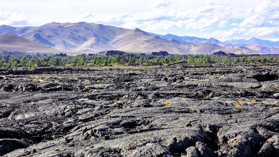 * **Life:** These islands of older soil provide a refuge for **Limber Pines** and **Sagebrush**, creating a stark green contrast against the black basalt.