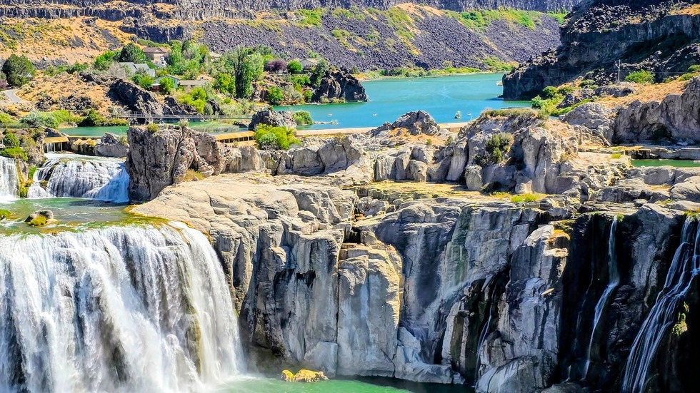 In the photo, the covered structures with the distinctive brown, curved roofs are part of the **Shoshone Falls Power Plant** infrastructure.