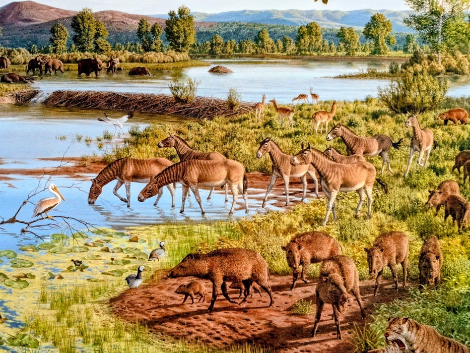 A paleoart illustration depicting the environment of the Hagerman Fossil Beds in Idaho during the Pliocene epoch, approximately 3.5 million years ago. The central animals are the Hagerman horse (Equus simplicidens), one of the oldest known species of the genus Equus and an ancestor to modern horses.