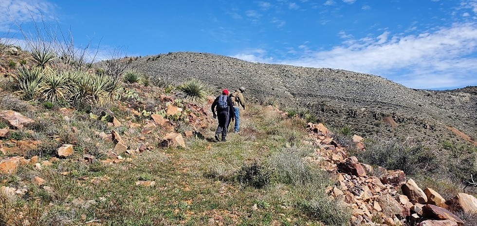 following an old grassy mining road. Francisco and Brian are up ahead.
