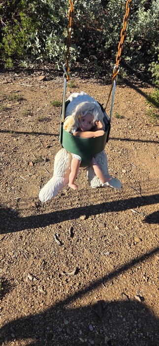 Linda enjoys her time in the swing with Punch the Monkey.