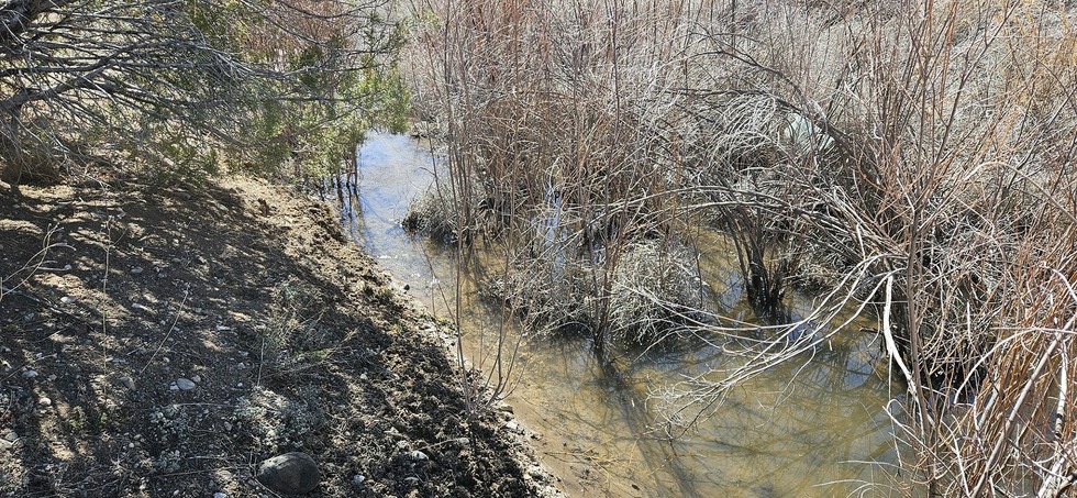The ditch, flowing with water from the river, filling the lake.