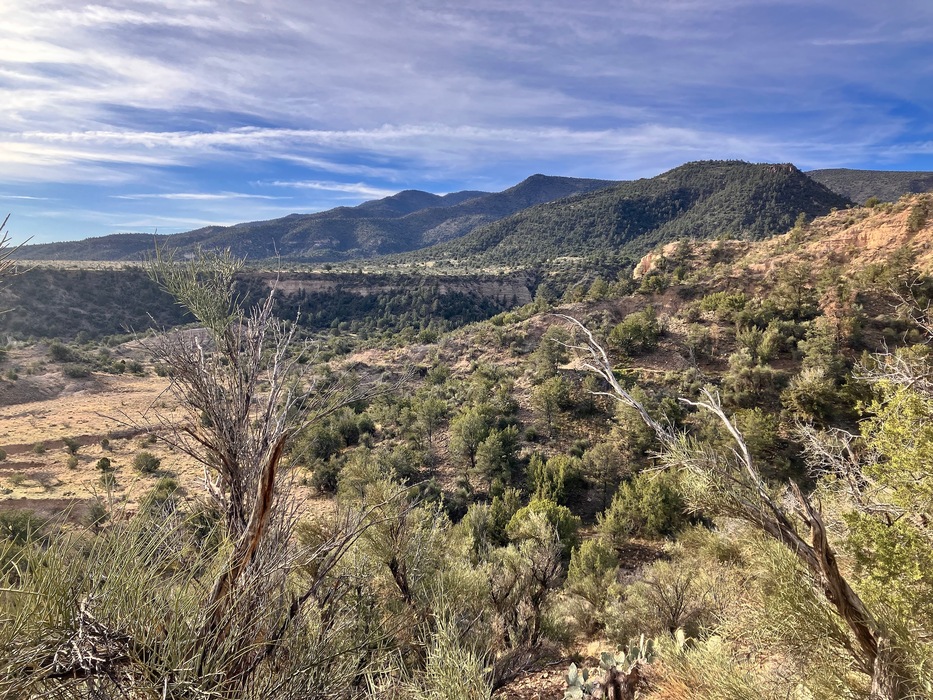 Starting the descent down from the shelf. At times the trail is cut nicely into the slope. You can see it in the distance making its way down.