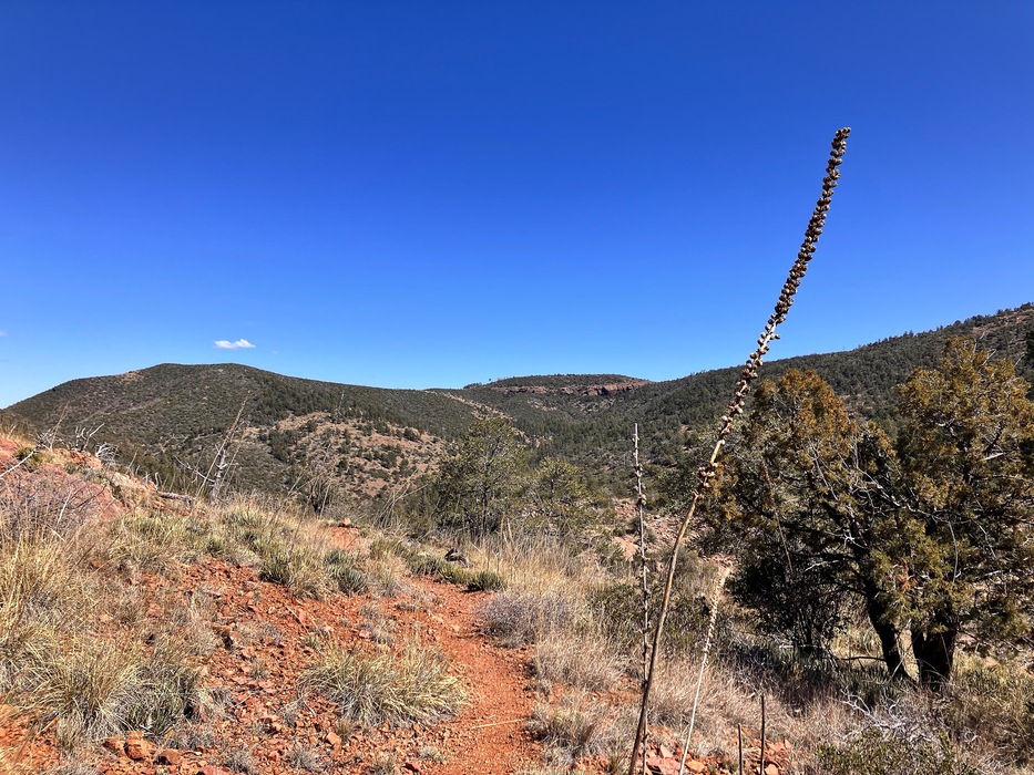 The trail descends into the valley and then climbs and exits to the left of the rock bluffs