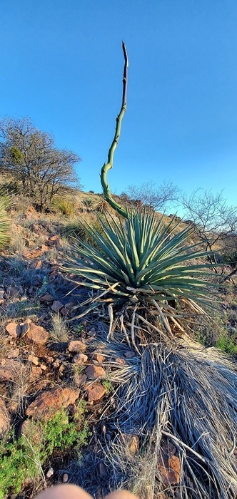 agave with a twisted stalk growing out. reminds me of a giant asparagus stalk.
