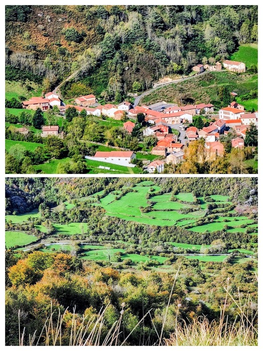 Notice how the green is much more intense and "manicured" than the surrounding wild forest. This is because these fields are actively managed. They are usually walled off with dry-stone boundaries (muros de piedra seca) to keep livestock out during the growing season so the grass can be harvested for winter hay.