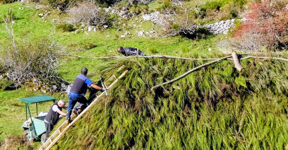 The man at the top of the ladder is likely the teyon. He directs the others on where to place each bundle. Notice the blue truck—modern transport has made this slightly easier, but the work on the roof itself remains exactly as it was in the Middle Ages.