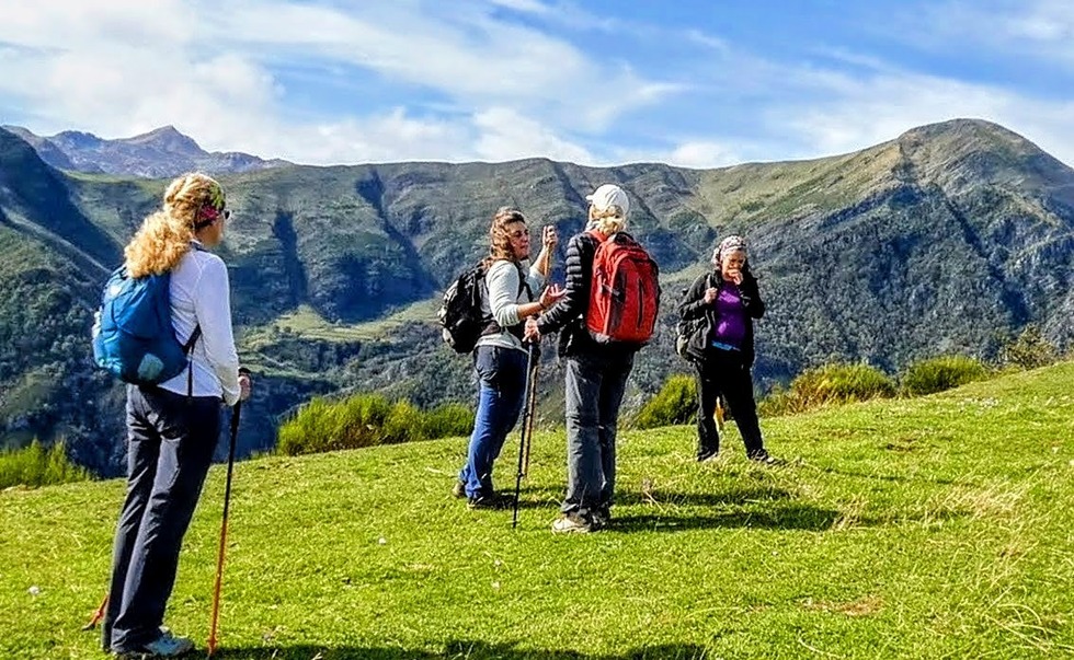 a couple of our RS talking to the local guide in jeans and our main guide, Carlota, is on the right. We are viewing the high-altitude border between Asturias and León.