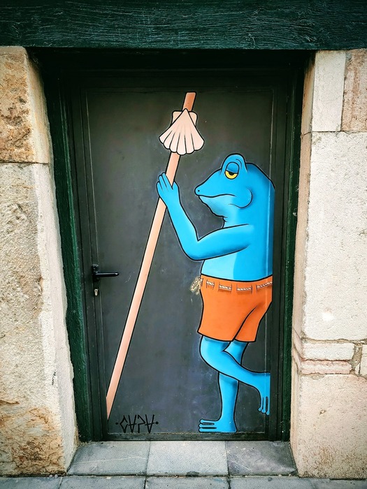 2. The Pilgrim’s Staff (El Bordón)The long wooden pole held by the frog is a bordón.Support & Defense: Symbolically, it represents the "third leg" of the pilgrim, providing support during spiritual and physical exhaustion.Spiritual Meaning: In medieval times, it was said to represent the pilgrim’s fight against the "snares of the devil" and the wild animals (or bandits) they might encounter.