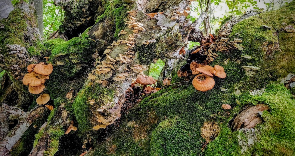 Role: These are saprobic fungi, meaning they are the forest's primary recyclers. They are specifically breaking down the cellulose in that fallen beech log, returning nutrients to the soil of the Somiedo Natural Park.