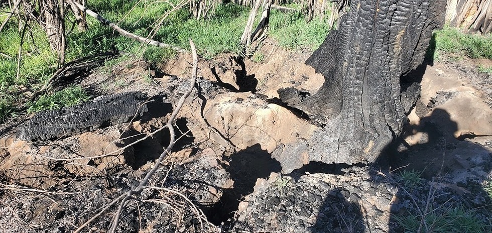 burned tree and roots. a fire must be incredibly hot to burn all of the roots leaving holes in the ground.