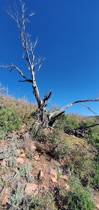 hiking down through a burned area