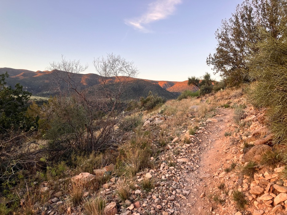Still in the first mile of the trail. The sunlight begins to color the distant mountains