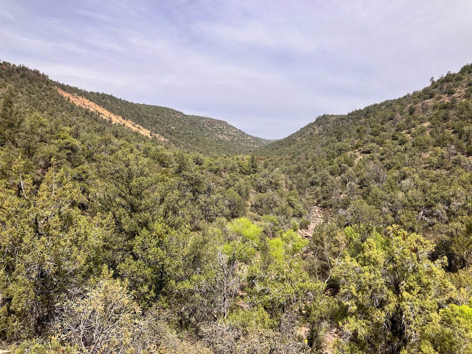 Starting the ascent on the other side of the valley. Very gradual. Dry stream bed visible in the distance. As the trail climbs it comes very close to the barren spot, but switchbacks before reaching it