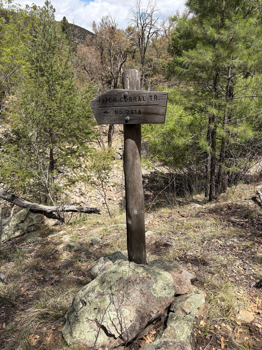 The only extant sign at the junction of Fitch Corral, Rock Creek, and Turkey Pen trails.