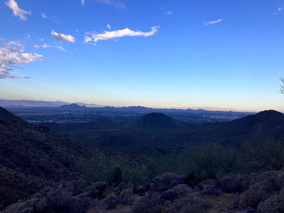 From a saddle on Andrew Kinsey. East valley in the shadows. West valley in the sun. White Tank Mountains illuminated in the distance