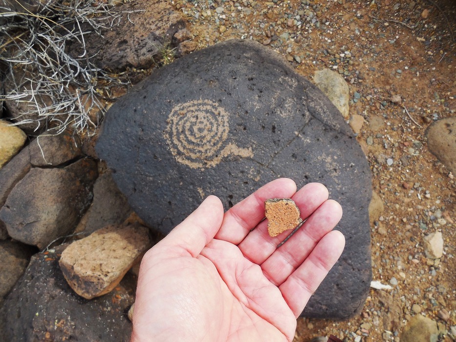 Snake petroglyph and potsherd