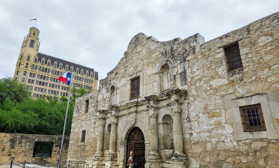 In the background, the Emily Morgan Hotel, known for its Gothic Revival architecture, rises behind the mission walls.