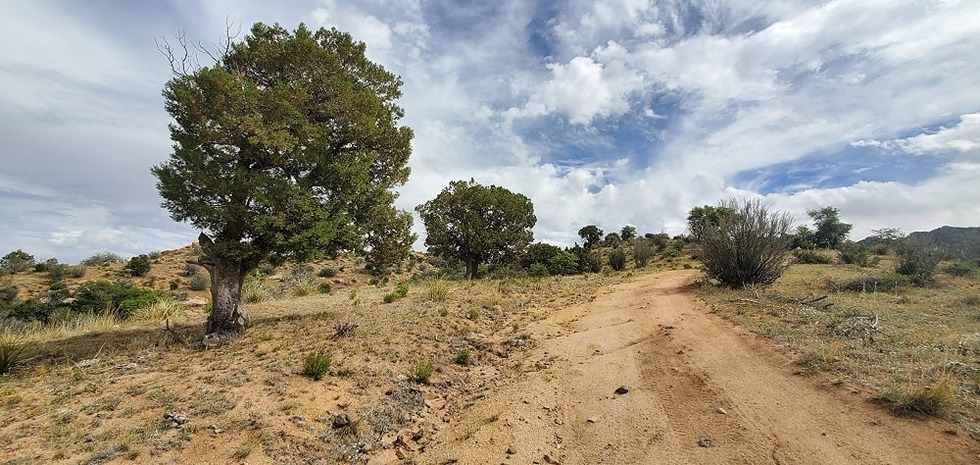 walking down the road. there were a few juniper trees in the area.
